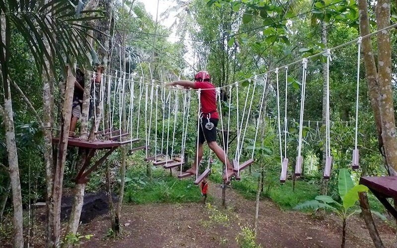 Enjoy fun air environment at Bedugul Bali by trying Treetop challenges such as suspended bridge, Spider Nets, Tarzan Jumps, Flying Fox, Flying Swings, and many more
