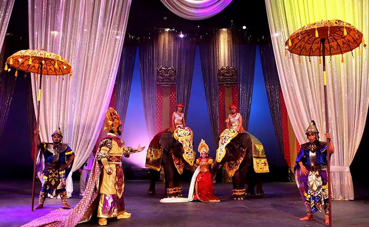 Bali Agung’s main stage is separated from the audience by a narrow pond. Initial episodes feature boatmen pedalling across and real ducks herded through the water. The opening scenes present a regal parade with the king’s character riding an elephant, followed by his loyal subjects and various animals from the Bali Safari & Marine Park.