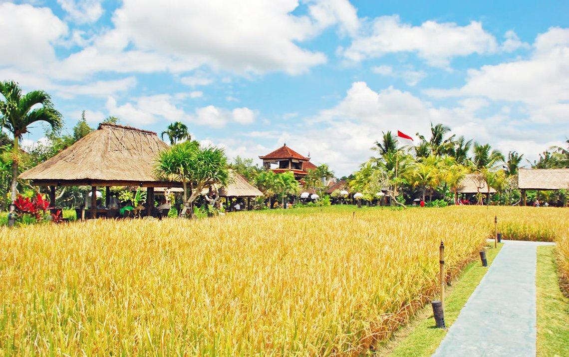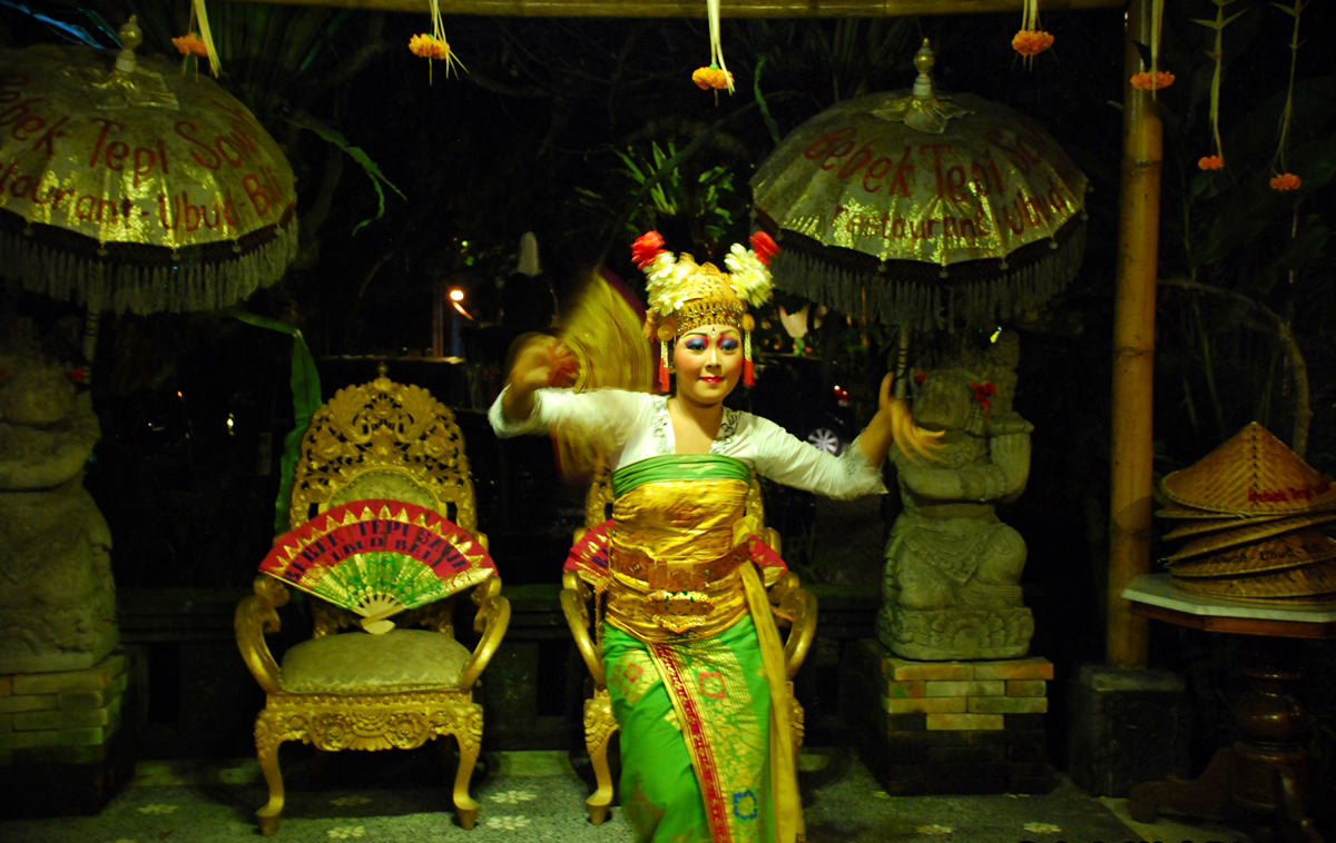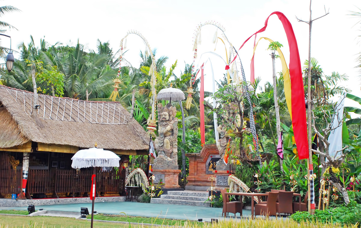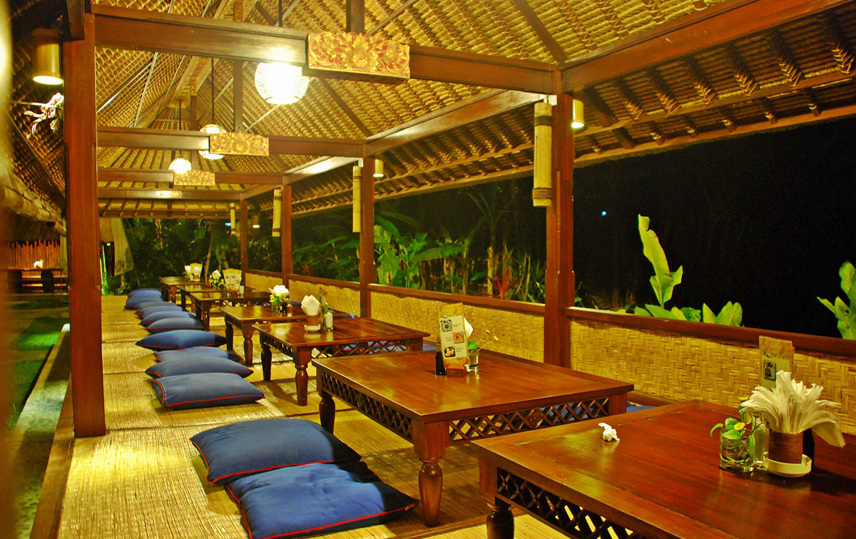 Come for dinner and you will be treated to a soothing experience as the rice fields are lined with oil torches with the natural sounds of crickets mixed with the flowing music of traditional Balinese gamelan. Dancers and Balinese musicians provide diners with live entertainment to complete this rustic Balinese dining experience. Saturday evenings from 19:30 onward particularly feature dancers performing a lively Joged Bumbung repertoire accompanied by a bamboo orchestra.
