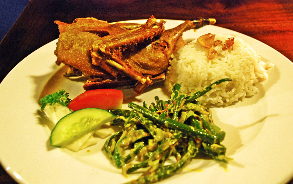 Bebek Tepi Sawah family recipes are well maintained, making it a great place to savour rich Balinese flavors and fall in love with the spiciness of the cuisine. There is also seafood on the menu, the likes of the fried or grilled gourami and prawn. Balinese must-tries besides the signature duck, include the bebek betutu and ayam betutu (slow-cooked smoked duck and chicken, the poultry equivalent of Bali’s amazingly juicy pork ribs or spit-roast babi guling ‘suckling pig’). Prices of the dishes range between IDR 51,000 to 95,000.