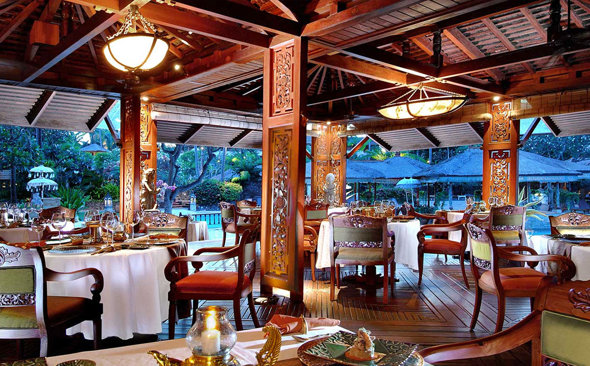 Raja’s Balinese Cuisine is an award-winning beachfront restaurant located within the Nusa Dua Beach Hotel & Spa Bali. Raja’s serves Balinese culinary treats with ingredients and tastes for all. Its name in Indonesian means ‘Of Kings’ and it aptly features a royal-themed, well-illuminated wooden interior and exterior, complemented by unique Balinese décor of crafts and fabrics.