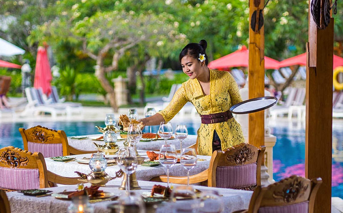 This Nusa Dua Beach Hotel & Spa Bali’s signature restaurant is located within walking distance from the sands of Nusa Dua Beach adjacent the resort’s main swimming pool. This location makes for a panoramic dining experience at Raja’s, especially when seated on its outdoor patio.