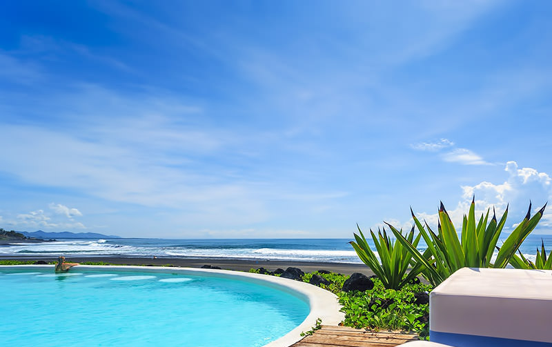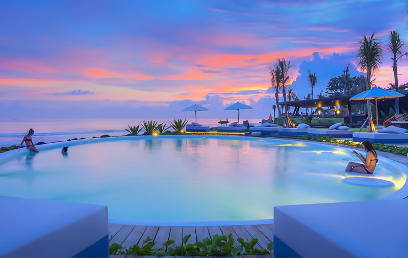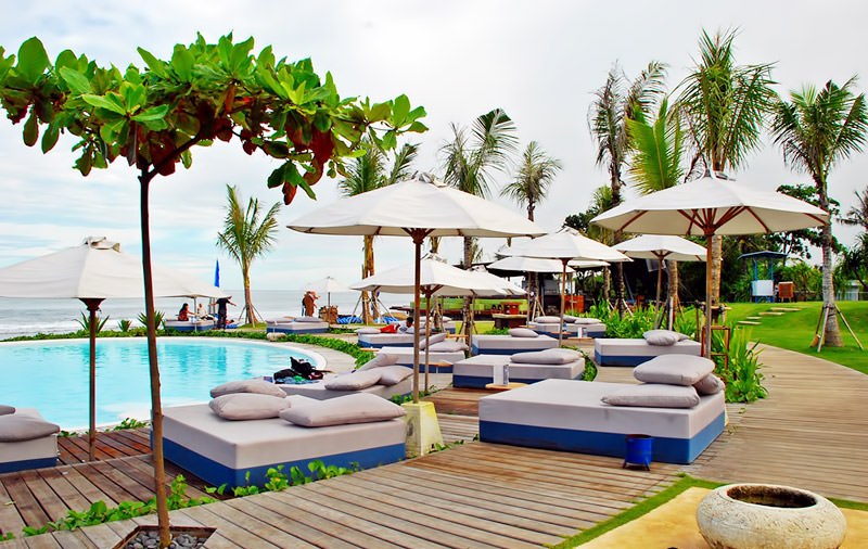 A bridge with a surfboard-shaped sign leads you to the beach club, where you’ll soon see Nusa Penida Island on the far horizon and the waves. Before the wide ocean views is the main restaurant and bar, a circular structure that looks a bit like a giant mushroom, dappled with black canvas awnings and with green beach facing sofas on wooden decks. The spacious green lawns surround an amazing 20x10m aquamarine infinity pool that also takes a circular form. You can kick back and listen to tunes, surf the net via free Wi-Fi, and enjoy a good read or a soothing massage on one of the daybeds under wide parasols. The daybeds surround the pool on an open-tiered timber decking.