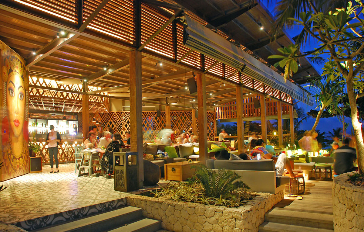 The beachfront location ensures great views at any time of day. Nonetheless, the best time to go is surely around sunset. For this, you should try to book one of the white terrazzo pods. Couples will find a cosy and more intimate option at the semi-al fresco lounge, featuring comfy sofas and a wooden panel backdrop with murals of Balinese Legong dancers.