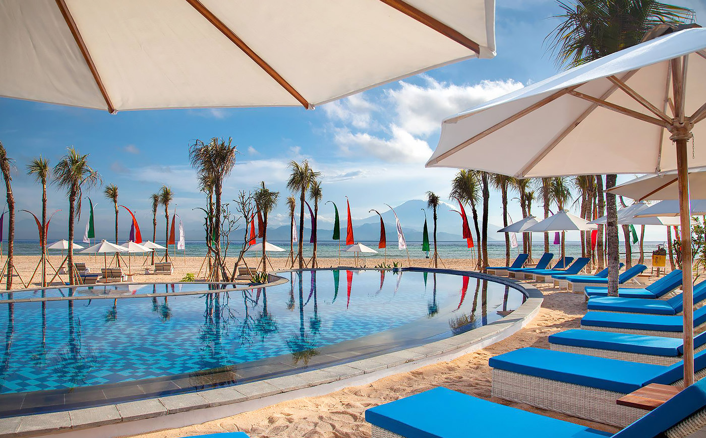 Mahagiri Lembongan Beach Club is the signature beachfront dining venue of the Mahagiri Resort. The beach club is one of Lembongan Island’s great beachfront locations where you can enjoy all-day dining or sip cocktails while taking in the seaside ambiance and ocean views with Bali and Mount Agung on the horizon. Its main restaurant area has semi-outdoor tables with lovely seashell décor, while out on its spacious sandy area, you have the choice of sun loungers around a large freeform pool or on the sand.