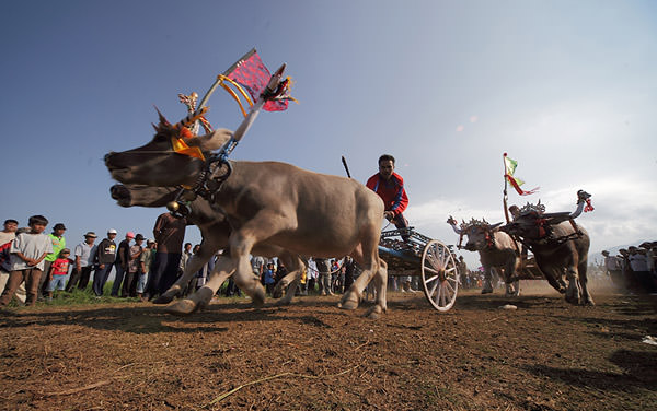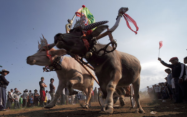 Makepung is the name of a major annual racing event that takes place around Jembrana in West Bali, featuring racing buffaloes. Hundreds of pairs of buffaloes are teamed up together with their farmer-turned-jockeys who ride like charioteers on the traditional wooden ploughs, which are slightly modified for the competition.